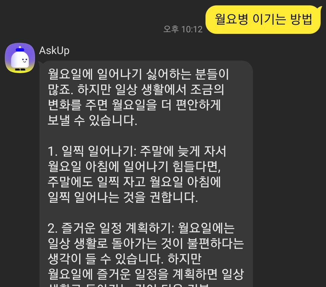 또한, "월요병 이기는 방법"이라고 물으면 월요병을 이기는 방법에 대해 알려줍니다.