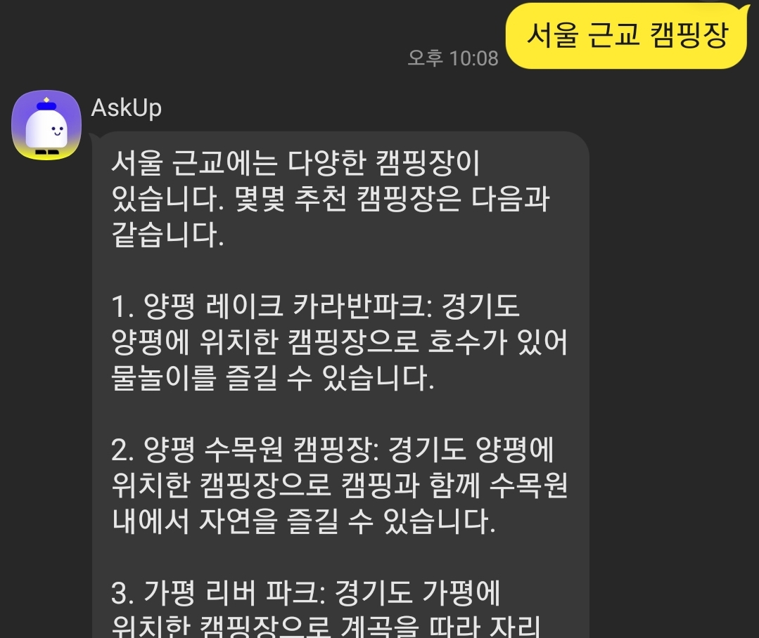 예를 들어, "서울 근교 캠핑장"이라고 물으면 서울 근교의 캠핑장에 대한 정보를 찾아줍니다.